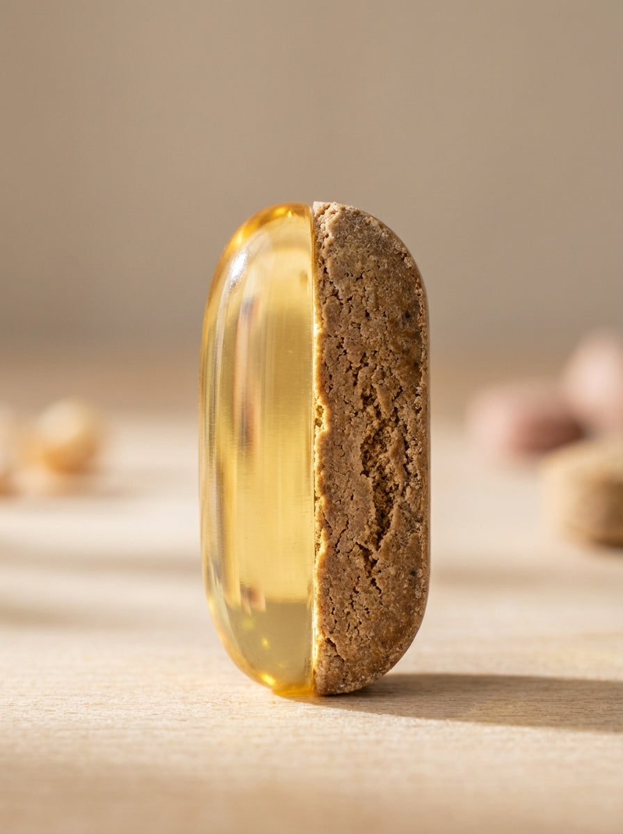 Our softgel delivers therapeutic-level EPA and DHA in natural triglyceride form — the only form the body absorbs directly into skin cells without conversion loss. Sealed inside an airtight capsule, the omega-3s are protected from air, heat, and oxidation until the moment they dissolve in your dog's stomach.
